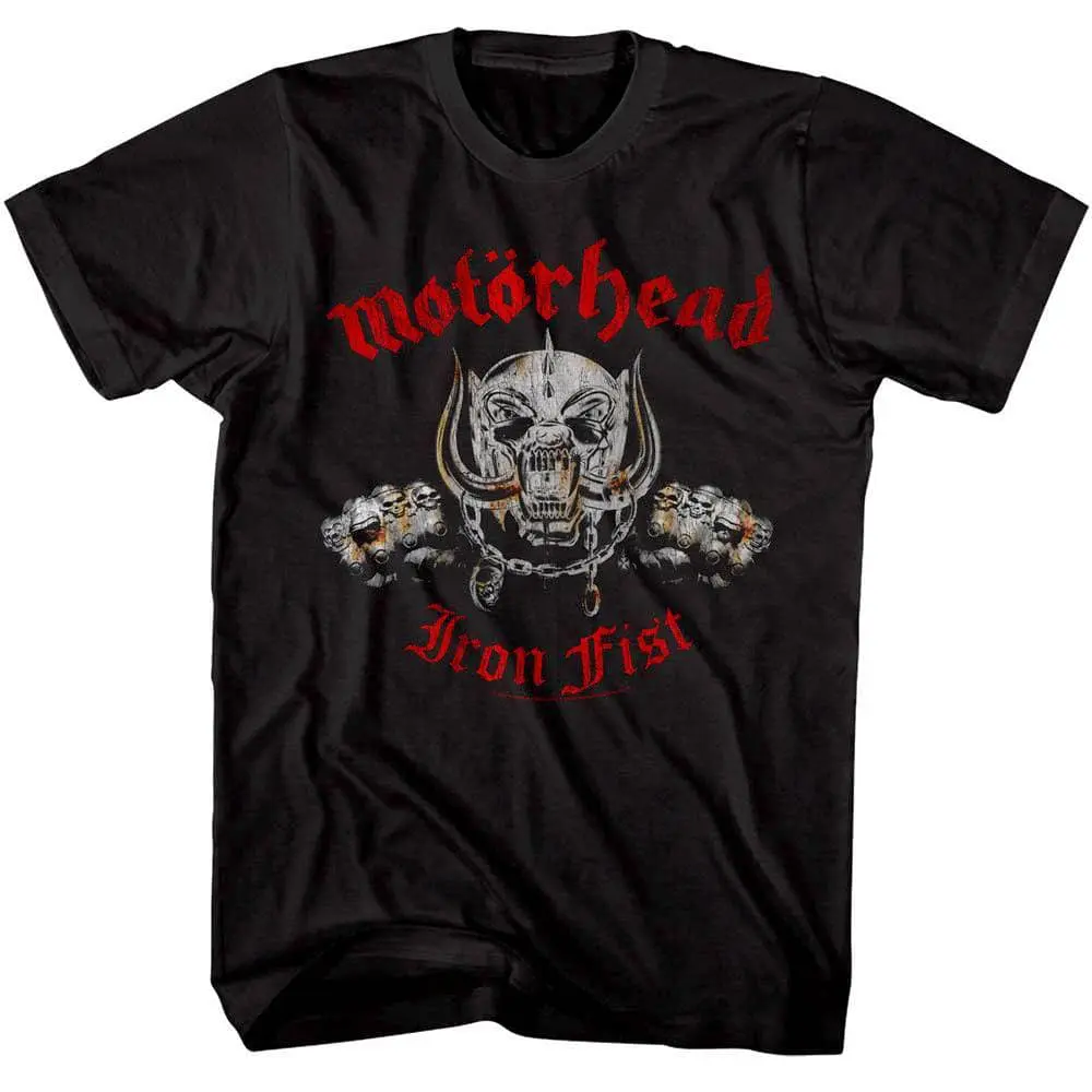 The legendary Lemmy Kilmister and his Motörhead band are considered the very beginning of the wave of British heavy metal (NWOBHM) in the 70’s. Motörhead were a power trio always featuring Lemmy, and though several guitarists and drummers have played in the line-up, most of their best-selling albums and singles feature drummer Phil “Philthy Animal” Taylor and guitarist “Fast” Eddie Clarke. Motorhead released 23 studio albums, 10 live recordings, 12 compilation albums and five EPs over a career spanning 40 years. Lemmy always said that the band are more than Rock n’ Roll but also encompass Punk, Rock and Heavy Metal and he always sang about important themes. So if you always have an Ace up your sleeve, this distressed Motorhead Iron Fist T-Shirt looks like you got it at a mosh pit in the 80’s.