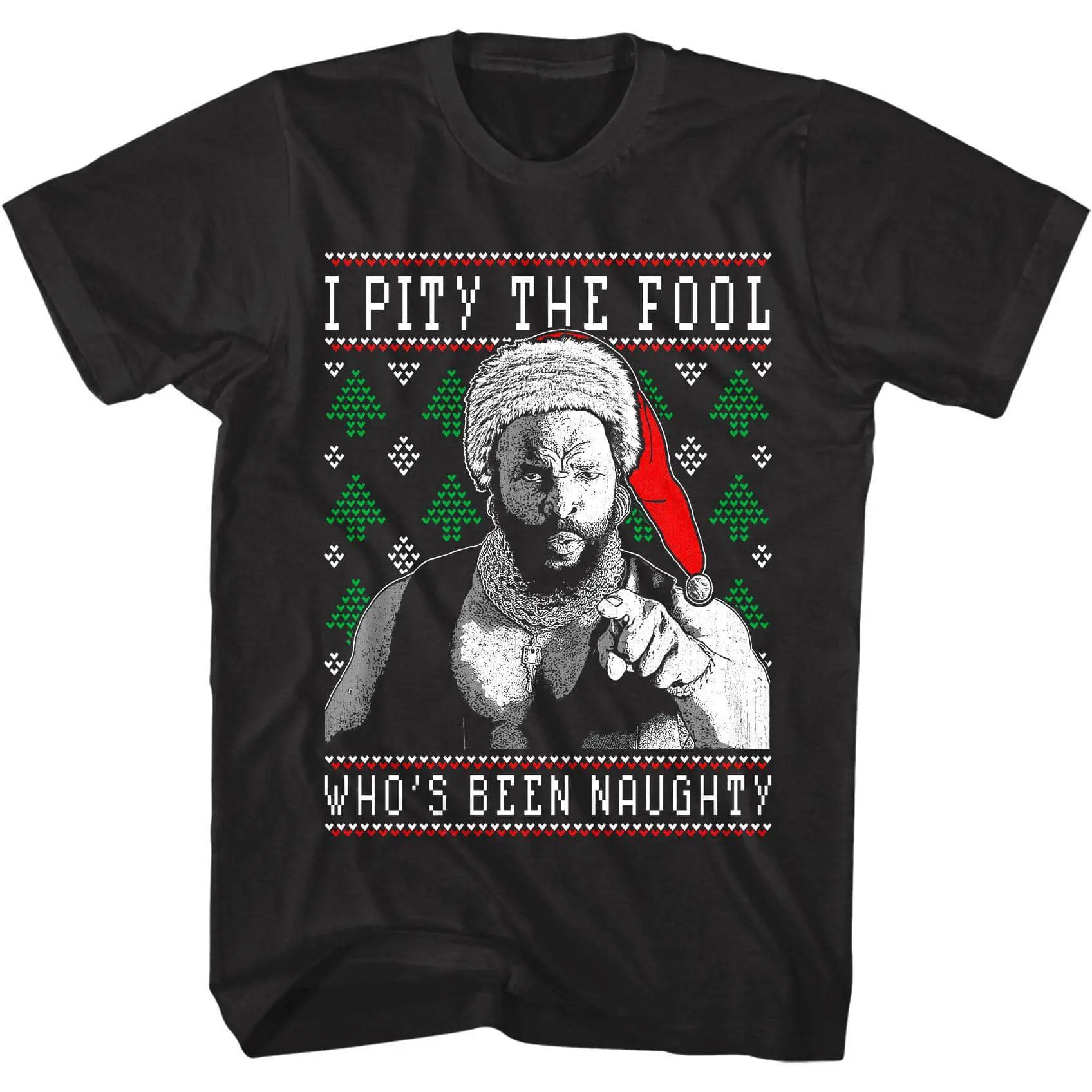 Gold Bling chains, huge muscles and a mohawk hairstyle – you know who I am talking bout. Mr. T is a former wrestler, movie actor and TV personality mainly known for his role B.A. Baracus in the 1990 television series A-Team. He was then catapulted to Hollywood stardom playing boxing villain Clubber Lang in the third Rocky movie. He’s well known mostly for his distinctive mohican hairstyle, gold jewelry, his tough guy image and his famous quotes like “I Pity the fool”. If you do a mean Mr. T impression then you will love this faded Mr. T Pity the Naughty T-Shirt, you will never look like the fool!
