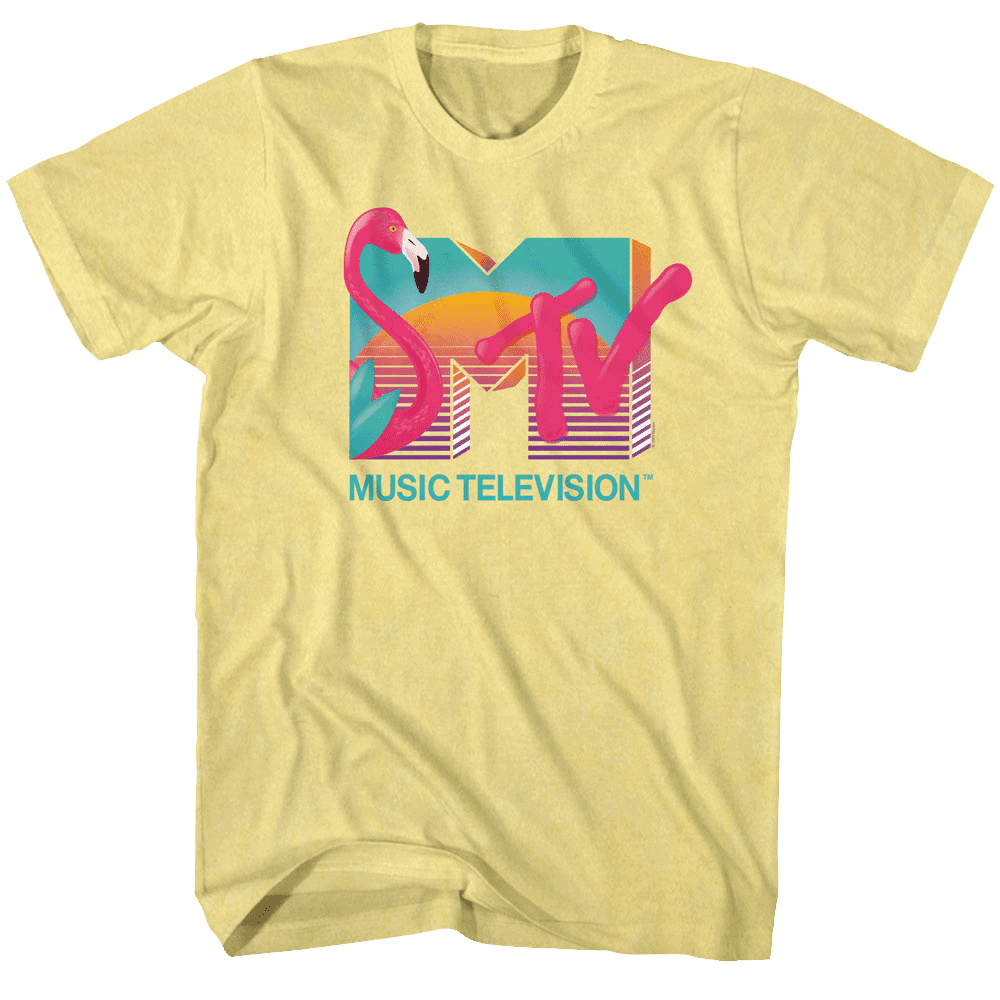 If you don’t know MTV – where have you been for the last 30 years?! Music Television originally launched by only airing music videos guided by VJ’s (Video Jockeys). In the mid-90’s MTV swerved away from just videos and started producing shows – succeeding with many reality shows. So if you love the newest music videos, watching car transformations on Pimp My Ride or being on TV drinking on Spring Break or listening to Snooki on the Jersey Shore or checking Carson Daly on TRL or just headbanging – Then MTV is the station for you. This vintage style MTV Flamingo Sunset Logo t-shirt just oozes 90’s cool and will save you from Ridiculousness!