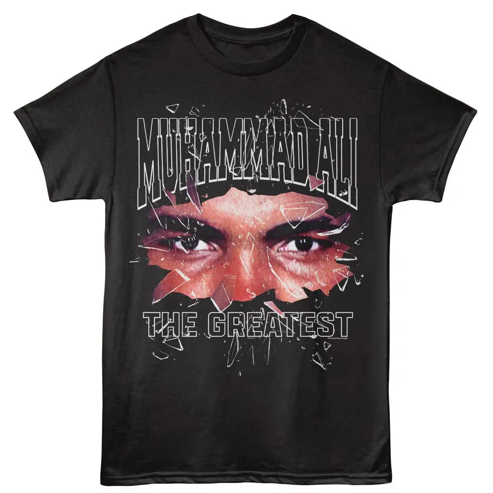 Cassius Marcellus Clay Jr aka Muhammad Ali is widely considered as one of the greatest boxers of all time, in fact “The Greatest” was his nickname. Born and raised in Louisville, Kentucky, at just 18 he won a gold medal in the light heavyweight division at the 1960 Summer Olympics. After turning pro and becoming heavyweight champion for the first time, Clay converted to Islam in 1961 and eventually took the name Muhammad Ali. The undisputed heavyweight world champion on 4 occasions, Ali was an icon in an era of legendary fighters. For real boxing fans, this graphic Muhammad Ali Eyes of the Greatest t-shirt has a vintage style print with a distressed look as if you bought it on fight night in the 70’s.
