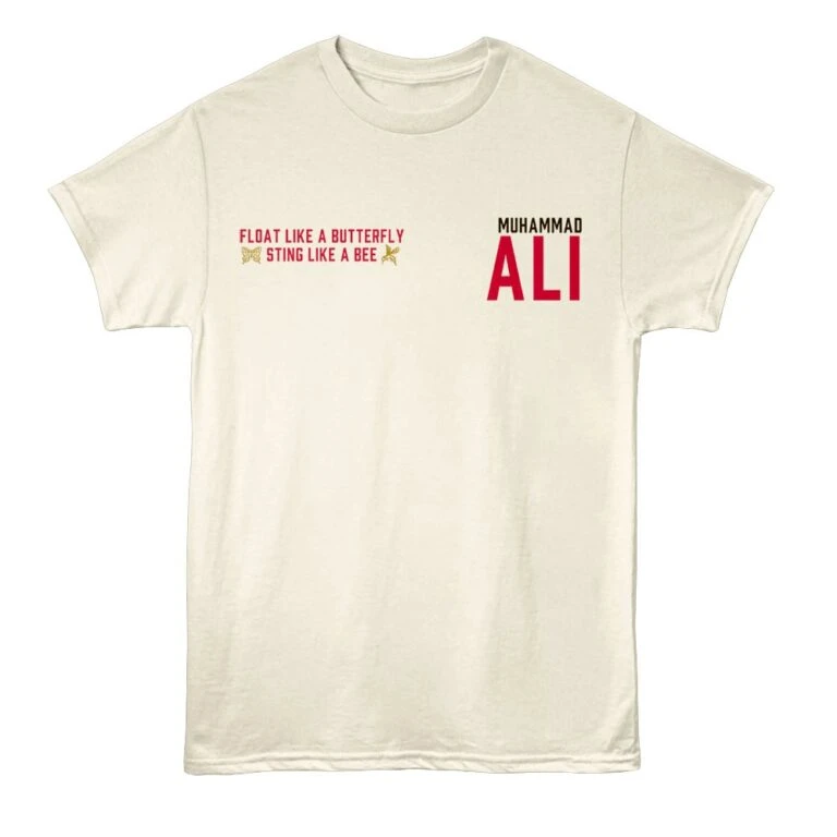 Cassius Marcellus Clay Jr aka Muhammad Ali is widely considered as one of the greatest boxers of all time, in fact “The Greatest” was his nickname. Born and raised in Louisville, Kentucky, at just 18 he won a gold medal in the light heavyweight division at the 1960 Summer Olympics. After turning pro and becoming heavyweight champion for the first time, Clay converted to Islam in 1961 and eventually took the name Muhammad Ali. The undisputed heavyweight world champion on 4 occasions, Ali was an icon in an era of legendary fighters. For real boxing fans, this graphic Muhammad Ali Float and Sting t-shirt has a vintage style print with a distressed look as if you bought it on fight night in the 70’s.