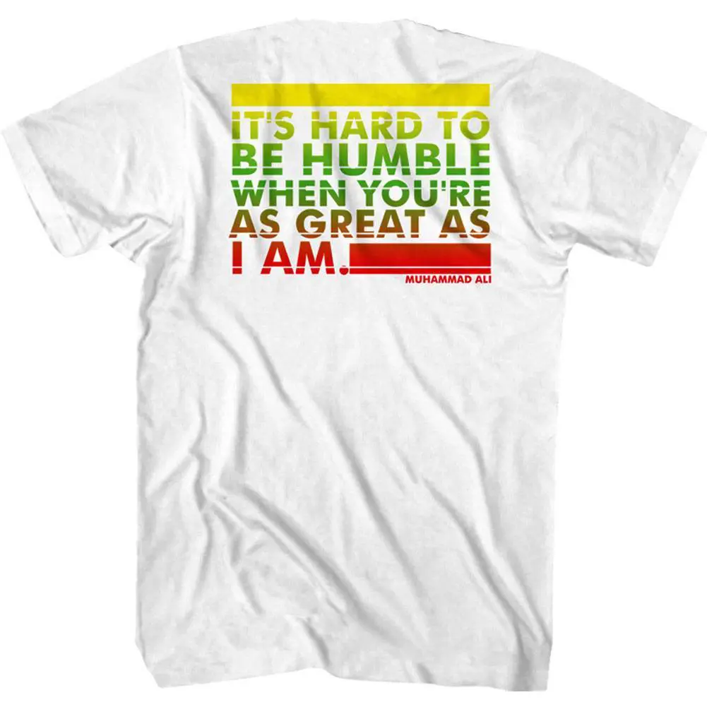 Cassius Marcellus Clay Jr aka Muhammad Ali is widely considered as one of the greatest boxers of all time, in fact “The Greatest” was his nickname. Born and raised in Louisville, Kentucky, at just 18 he won a gold medal in the light heavyweight division at the 1960 Summer Olympics. After turning pro and becoming heavyweight champion for the first time, Clay converted to Islam in 1961 and eventually took the name Muhammad Ali. The undisputed heavyweight world champion on 4 occasions, Ali was an icon in an era of legendary fighters. For real boxing fans, this graphic Muhammad Ali It’s Hard to be Humble t-shirt has a vintage style print with a distressed look as if you bought it on fight night in the 70’s.