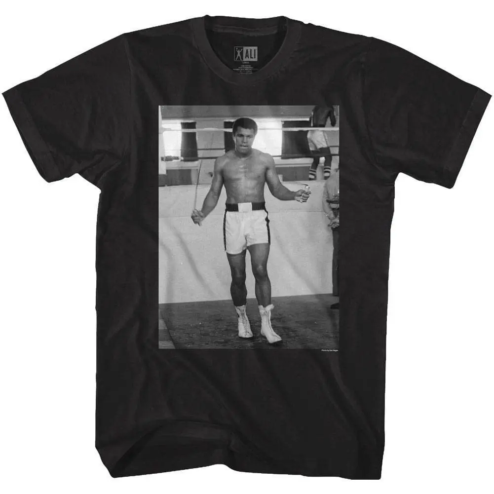 Cassius Marcellus Clay Jr aka Muhammad Ali is widely considered as one of the greatest boxers of all time, in fact “The Greatest” was his nickname. Born and raised in Louisville, Kentucky, at just 18 he won a gold medal in the light heavyweight division at the 1960 Summer Olympics. After turning pro and becoming heavyweight champion for the first time, Clay converted to Islam in 1961 and eventually took the name Muhammad Ali. The undisputed heavyweight world champion on 4 occasions, Ali was an icon in an era of legendary fighters. For real boxing fans, this graphic Muhammad Ali Jumping Rope t-shirt has a vintage style print with a distressed look as if you bought it on fight night in the 70’s.
