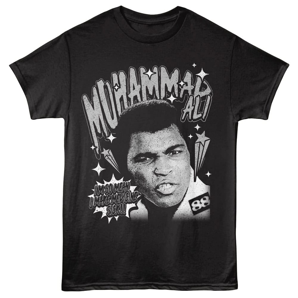 Cassius Marcellus Clay Jr aka Muhammad Ali is widely considered as one of the greatest boxers of all time, in fact “The Greatest” was his nickname. Born and raised in Louisville, Kentucky, at just 18 he won a gold medal in the light heavyweight division at the 1960 Summer Olympics. After turning pro and becoming heavyweight champion for the first time, Clay converted to Islam in 1961 and eventually took the name Muhammad Ali. The undisputed heavyweight world champion on 4 occasions, Ali was an icon in an era of legendary fighters. For real boxing fans, this graphic Muhammad Ali Make Medicine Sick t-shirt has a vintage style print with a distressed look as if you bought it on fight night in the 70’s.
