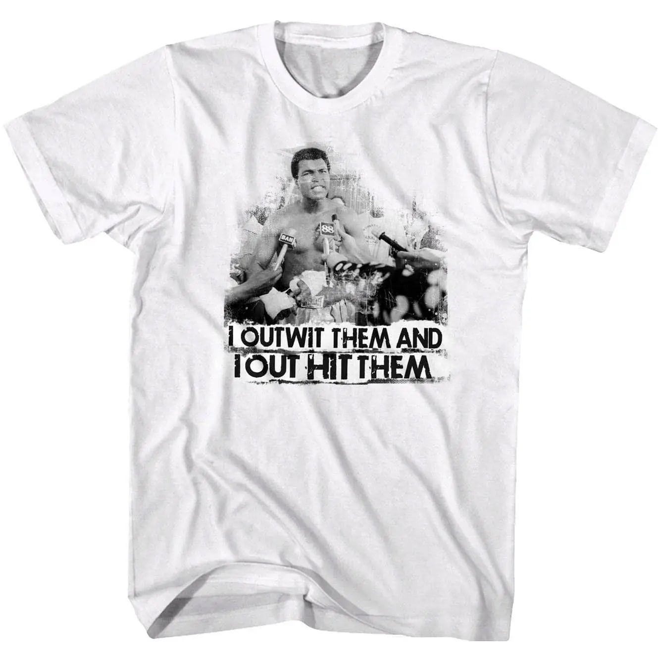 Cassius Marcellus Clay Jr aka Muhammad Ali is widely considered as one of the greatest boxers of all time, in fact “The Greatest” was his nickname. Born and raised in Louisville, Kentucky, at just 18 he won a gold medal in the light heavyweight division at the 1960 Summer Olympics. After turning pro and becoming heavyweight champion for the first time, Clay converted to Islam in 1961 and eventually took the name Muhammad Ali. The undisputed heavyweight world champion on 4 occasions, Ali was an icon in an era of legendary fighters. For real boxing fans, this graphic Muhammad Ali Outwit Then Out Hit Them t-shirt has a vintage style print with a distressed look as if you bought it on fight night in the 70’s.