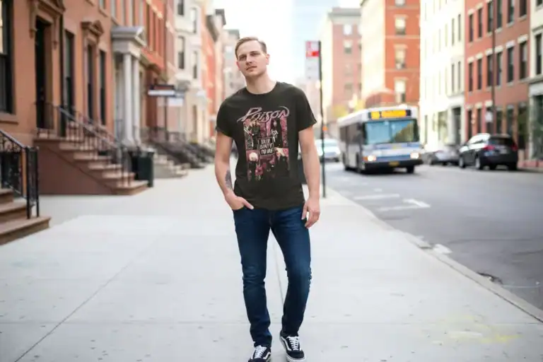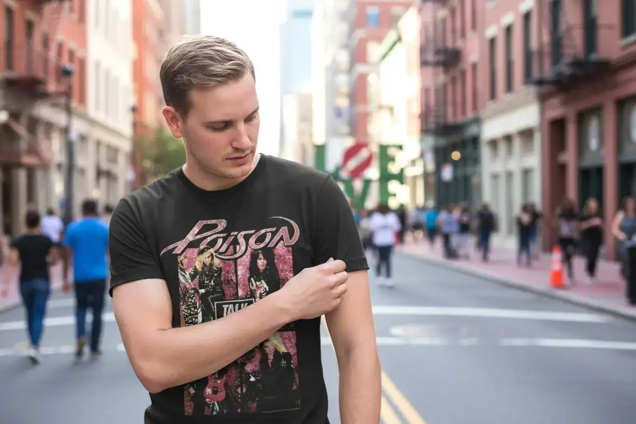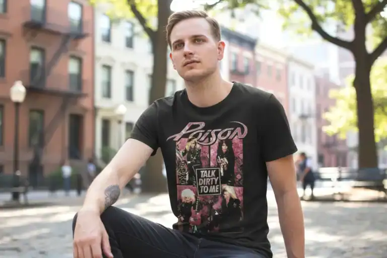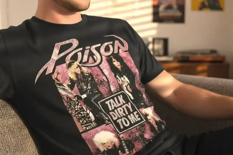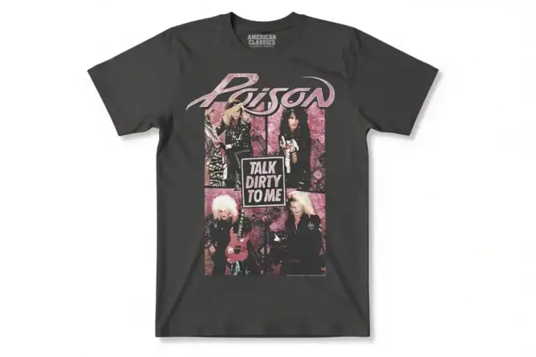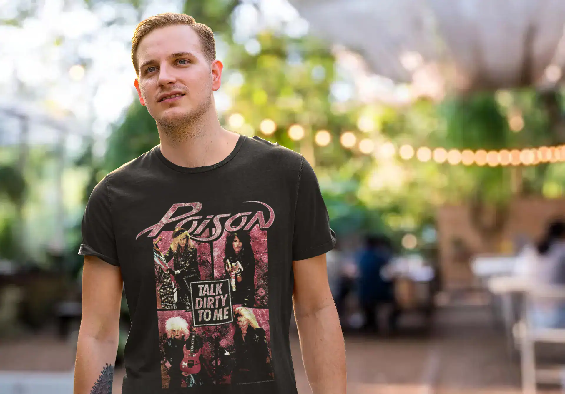 Look What the Cat Dragged In. Bret Michaels and his band, Poison are one of the most well-known Hair Metal Glam rock bands of the 80’s and 90’s. Every Rose Has Its Thorn was one of the best-selling tracks in the genre not to mention a karaoke classic. Poison have released 7 studio albums plus numerous compilations, their success drwe VH1 to name them 3rd best Hair band of the 80’s! The members of Poison have spent most of the last decade on various Reality TV Shows which has spawned new material and albums. This cool rock graphic Poison Talk Dirty To Me T-Shirt has a vintage worn-in look that looks like it came from a hair metal gig in the 90’s.