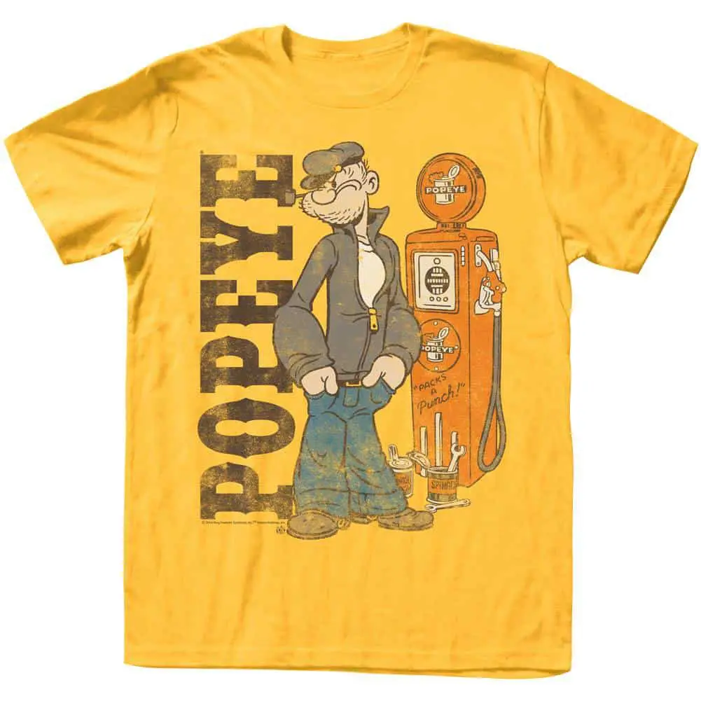 Sailor, Tough-guy, Hero – That’s Popeye. The underdog with bulging forearms, a mean uppercut and a love of canned spinach. Starting life as a comic strip, growing into one of the longest running cartoons and a movie too, around for over 90 years. Popeye the Sailor Man captured the hearts of millions of fans around the globe. The cartoon introduced some of Popeye’s friends such as Wimpy and Eugene the Jeep — plus his arch-nemesis Bluto (aka Brutus). All budding sailors will love this sea-inspired, fun graphic Popeye Vintage Gas Pump t-shirt as much as Popeye loves his girl Olive Oyl… and his spinach.