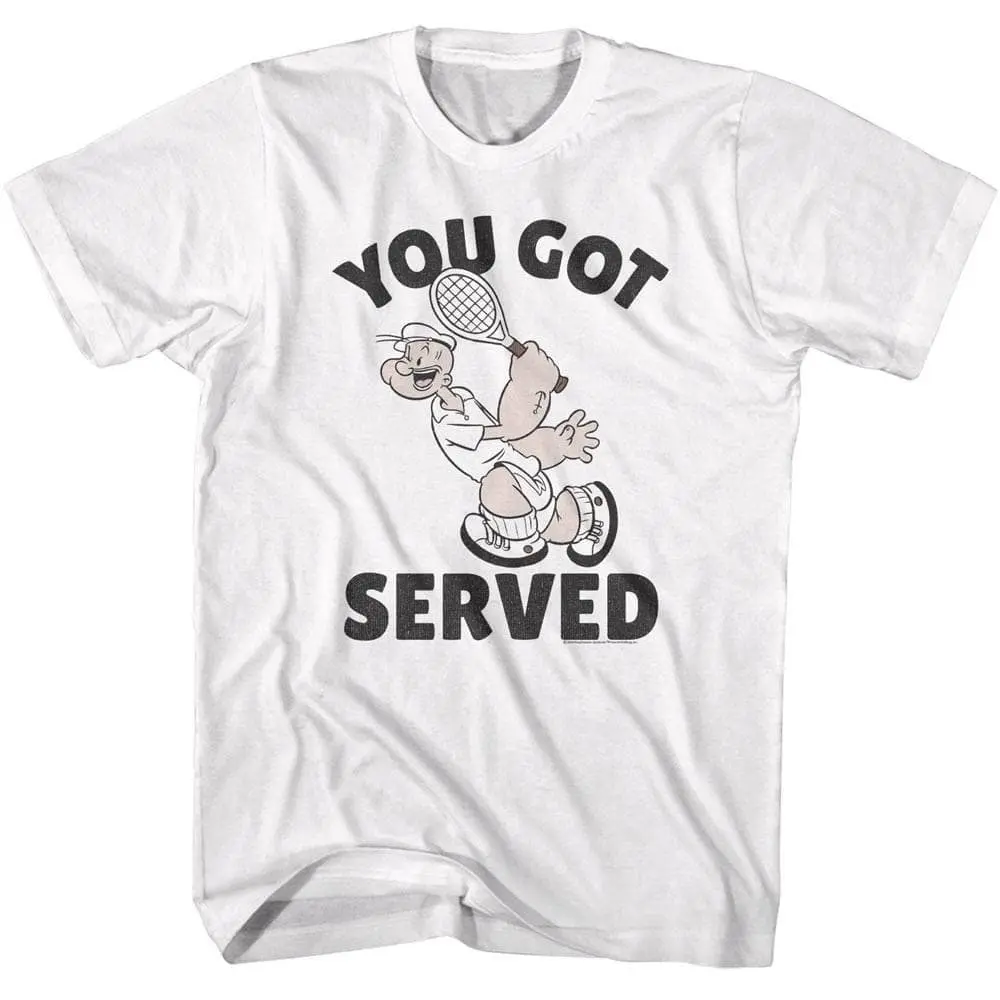 Sailor, Tough-guy, Hero – That’s Popeye. The underdog with bulging forearms, a mean uppercut and a love of canned spinach. Starting life as a comic strip, growing into one of the longest running cartoons and a movie too, around for over 90 years. Popeye the Sailor Man captured the hearts of millions of fans around the globe. The cartoon introduced some of Popeye’s friends such as Wimpy and Eugene the Jeep — plus his arch-nemesis Bluto (aka Brutus). All budding sailors will love this sea-inspired, fun graphic Popeye You Got Served Tennis t-shirt as much as Popeye loves his girl Olive Oyl… and his spinach.