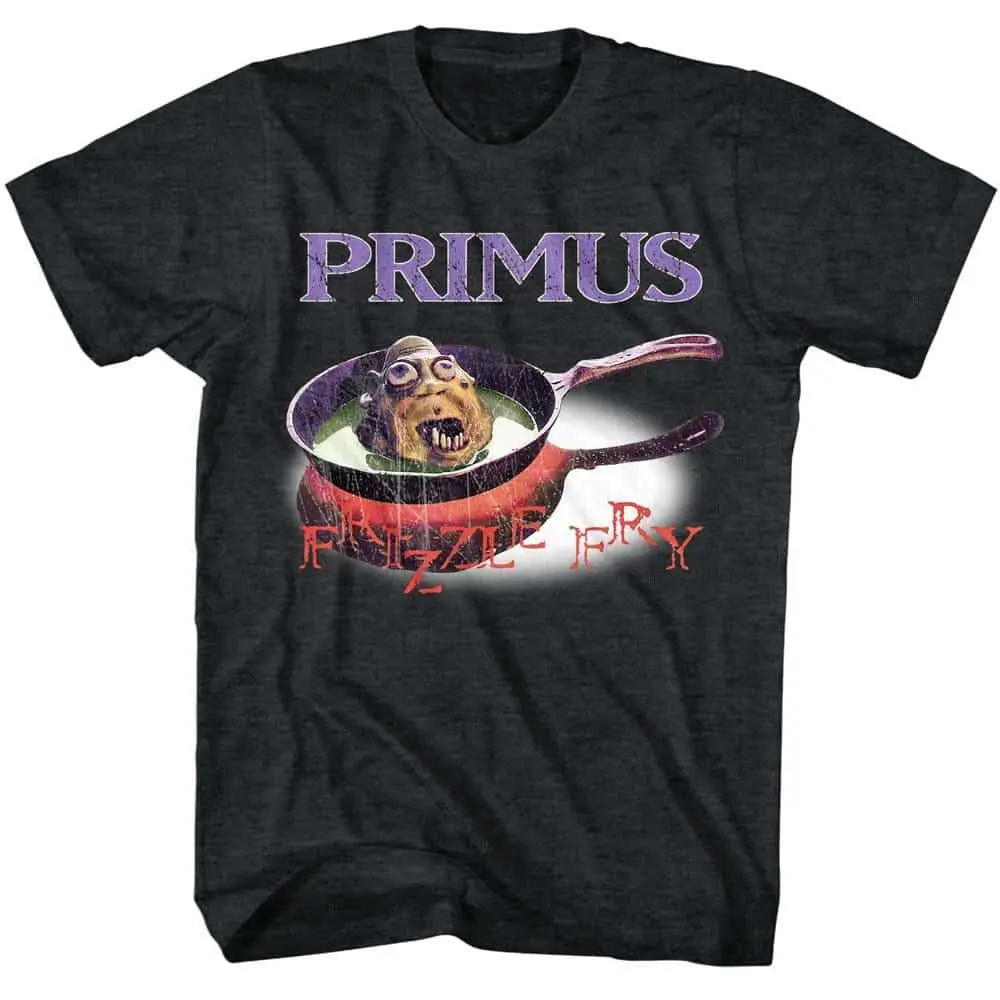 To describe Primus as a rock band is an understatement. Les Claypool founded the band in 1984 in California, Primus started as a thrash metal / funk outfit but the music style has morphed over the years. In fact, Primus is known for its irreverent, quirky approach to music distinguished by Claypool’s bass-first songwriting style and eccentric lyrical themes. Primus‘s musical style, which draws influences from progressive rock, metal, funk, and psychedelic music, has been noted as difficult to categorize and is most frequently described by critics as funk metal, a label the band has rejected. So if you are difficult to categorize then you will appreciate this weird & wonderful Primus Frizzle Fry Album T-Shirt.