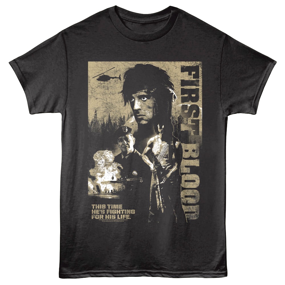 Rambo is one of those Hollywood movies that everyone knows. This action movie series follows John Rambo, a US Army veteran played by Sylvester Stallone, who is traumatized by his experience in the Vietnam War, and uses the skills he gained there to fight police, enemy troops and drug cartels. Did you know that Stallone co-wrote the screenplays of all five Rambo films, and directed one. In addition to the 5 films, the franchise also spawned an animated TV series, comic books, novels, video games and a Bollywood remake. This vintage-style graphic Rambo  t-shirt has a distressed look as if you brought it back from Nam (or at least in the 80's!)