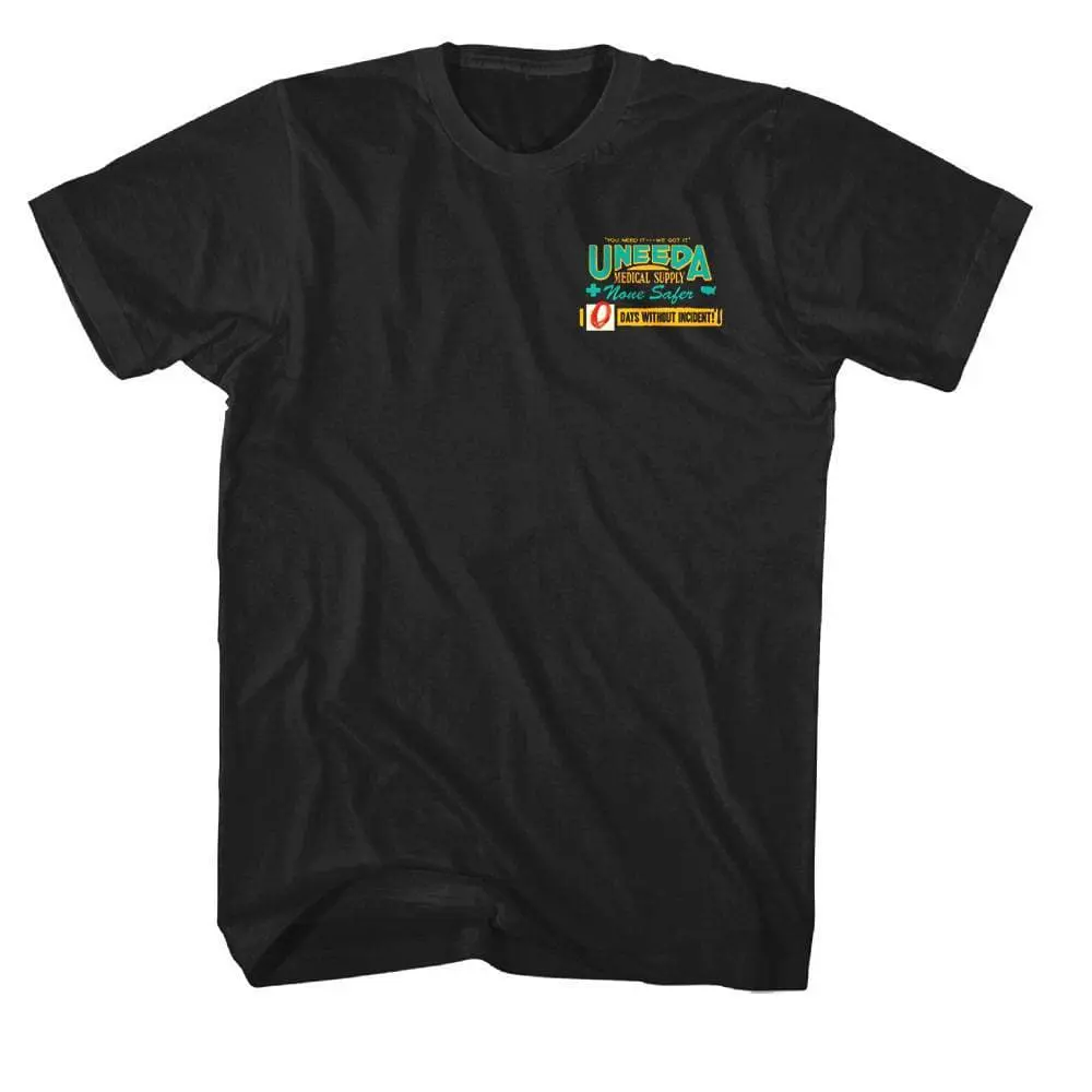 The classic horror-comedy franchise Return of The Living Dead is actually the result of a dispute between the directors (George A. Romero and John Russo) of their 1968 film, Night of the Living Dead over how to handle sequels. Romero’s dead series was more social commentary whereas Russo’s Living Dead movies were camp and over-the-top (aka topless zombies!). Despite being labelled Horror-comedy, Tarman in Return of The Living Dead will scare the living crap outta you! So if brain-eating-zombies are your jump-scare of choice then this outrageous Return of The Living Dead Uneeda Medical Supply T-Shirt is the perfect fashion addition for you.