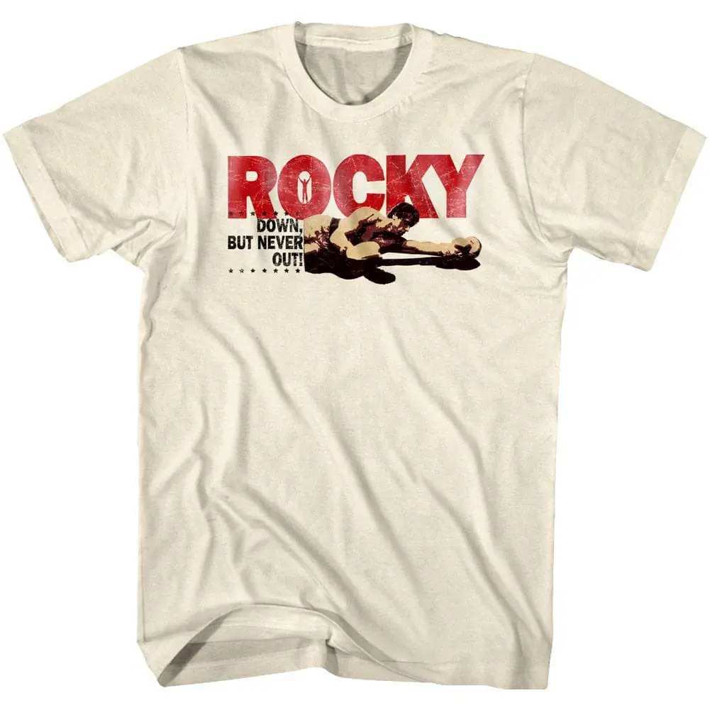 The greatest boxing movie franchise in film history! There are 6 movies following Rocky Balboa (played by Sylvester Stallone) fighting his way up from the streets to the big time. This is followed by the Rocky Creed movies, where Rocky becomes coach and mentor to Adonis Creed (the son of nemesis Apollo Creed). The original 6 movies were mostly written and directed by Sly Stallone himself. Legendary movies, memorable characters, invoke the heroic strength of Rocky Balboa with this inspirational boxing Rocky Down but Never Out t-shirt