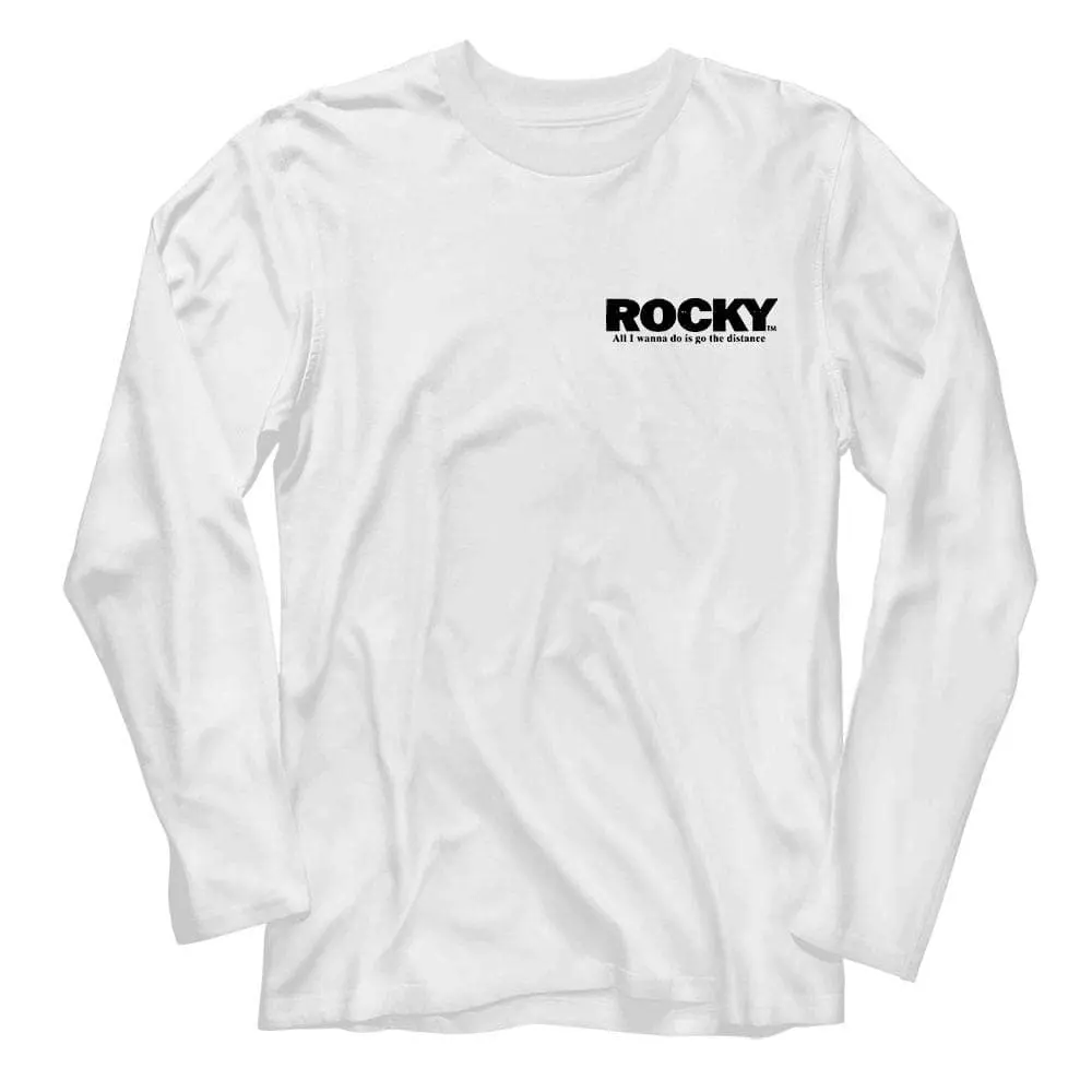 The greatest boxing movie franchise in film history! There are 6 movies following Rocky Balboa (played by Sylvester Stallone) fighting his way up from the streets to the big time. This is followed by the Rocky Creed movies, where Rocky becomes coach and mentor to Adonis Creed (the son of nemesis Apollo Creed from Rocky 1-4). The opposing boxers became notorious heels themselves like Mr. T’s ultra-violent Clubber Lang and the unstoppable Russian, Ivan Drago. The original 6 movies were mostly written and directed by Sly Stallone himself. Legendary movies, memorable characters, invoke the heroic strength of Rocky Balboa with this inspirational boxing Rocky Go The Distance Long Sleeve t-shirt and you’ll always have Mighty Mick in your corner.