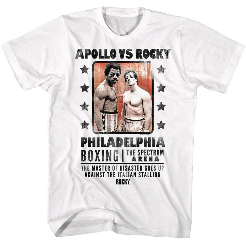 The greatest boxing movie franchise in film history! There are 6 movies following Rocky Balboa (played by Sylvester Stallone) fighting his way up from the streets to the big time. This is followed by the Rocky Creed movies, where Rocky becomes coach and mentor to Adonis Creed (the son of nemesis Apollo Creed from Rocky 1-4). The opposing boxers became notorious heels themselves like Mr. T’s ultra-violent Clubber Lang and the unstoppable Russian, Ivan Drago. The original 6 movies were mostly written and directed by Sly Stallone himself. Legendary movies, memorable characters, invoke the heroic strength of Rocky Balboa with this inspirational boxing Rocky v Apollo Fight Poster t-shirt and you’ll always have Mighty Mick in your corner.