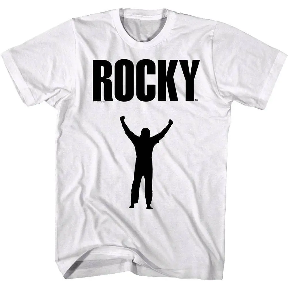 The greatest boxing movie franchise in film history! There are 6 movies following Rocky Balboa (played by Sylvester Stallone) fighting his way up from the streets to the big time. This is followed by the Rocky Creed movies, where Rocky becomes coach and mentor to Adonis Creed (the son of nemesis Apollo Creed). The original 6 movies were mostly written and directed by Sly Stallone himself. Legendary movies, memorable characters, invoke the heroic strength of Rocky Balboa with this inspirational boxing Rocky Victory Silhouette t-shirt