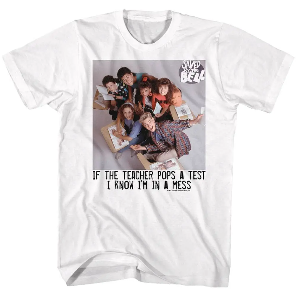 “When I wake up in the morning and the alarm gives out a warning – it’s alright because we’re Saved by the Bell“. SBTB is an Epic 90’s TV sitcom about a group of six close friends trying to make it through their teens while attending Bayside High School in California. Saved by the Bell shows daily trials of teens (and their principal) focusing on social issues affecting youngsters. Whether you relate to preppy Zack Morris or the cheerleading beauty Kelly Kapowski, or the jock QB AC Slater, or the class nerd Screech – this awesome graphic Saved by the Bell If The Teacher Pops a Test t-shirt will make you fit right in at Bayside High School!