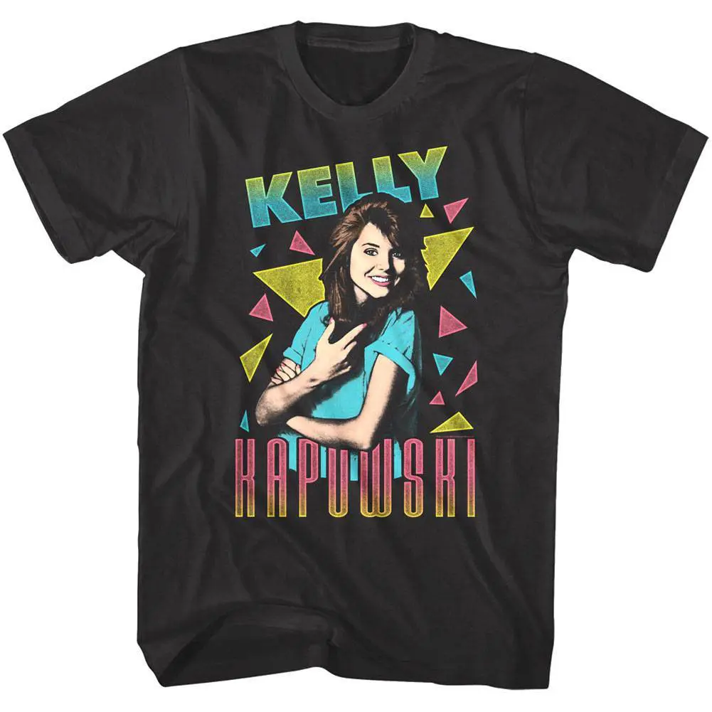 “When I wake up in the morning and the alarm gives out a warning – it’s alright because we’re Saved by the Bell“. SBTB is an Epic 90’s TV sitcom about a group of six close friends trying to make it through their teens while attending Bayside High School in California. Saved by the Bell shows daily trials of teens (and their principal) focusing on social issues affecting youngsters. Whether you relate to preppy Zack Morris or the cheerleading beauty Kelly Kapowski, or the jock QB AC Slater, or the class nerd Screech – this awesome graphic Saved by the Bell Kelly Kapowski Triangles t-shirt will make you fit right in at Bayside High School!