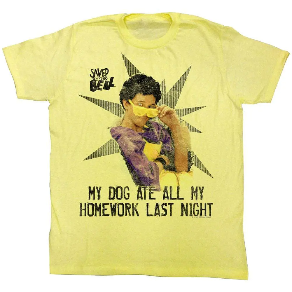 “When I wake up in the morning and the alarm gives out a warning – it’s alright because we’re Saved by the Bell“. SBTB is an Epic 90’s TV sitcom about a group of six close friends trying to make it through their teens while attending Bayside High School in California. Saved by the Bell shows daily trials of teens (and their principal) focusing on social issues affecting youngsters. Whether you relate to preppy Zack Morris or the cheerleading beauty Kelly Kapowski, or the jock QB AC Slater, or the class nerd Screech – this awesome graphic Saved by the Bell My Dog Ate All My Homework t-shirt will make you fit right in at Bayside High School!