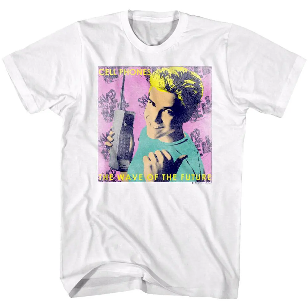 “When I wake up in the morning and the alarm gives out a warning – it’s alright because we’re Saved by the Bell“. SBTB is an Epic 90’s TV sitcom about a group of six close friends trying to make it through their teens while attending Bayside High School in California. Saved by the Bell shows daily trials of teens (and their principal) focusing on social issues affecting youngsters. Whether you relate to preppy Zack Morris or the cheerleading beauty Kelly Kapowski, or the jock QB AC Slater, or the class nerd Screech – this awesome graphic Saved by the Bell Zack Cell Phones Wave of the Future t-shirt will make you fit right in at Bayside High School!