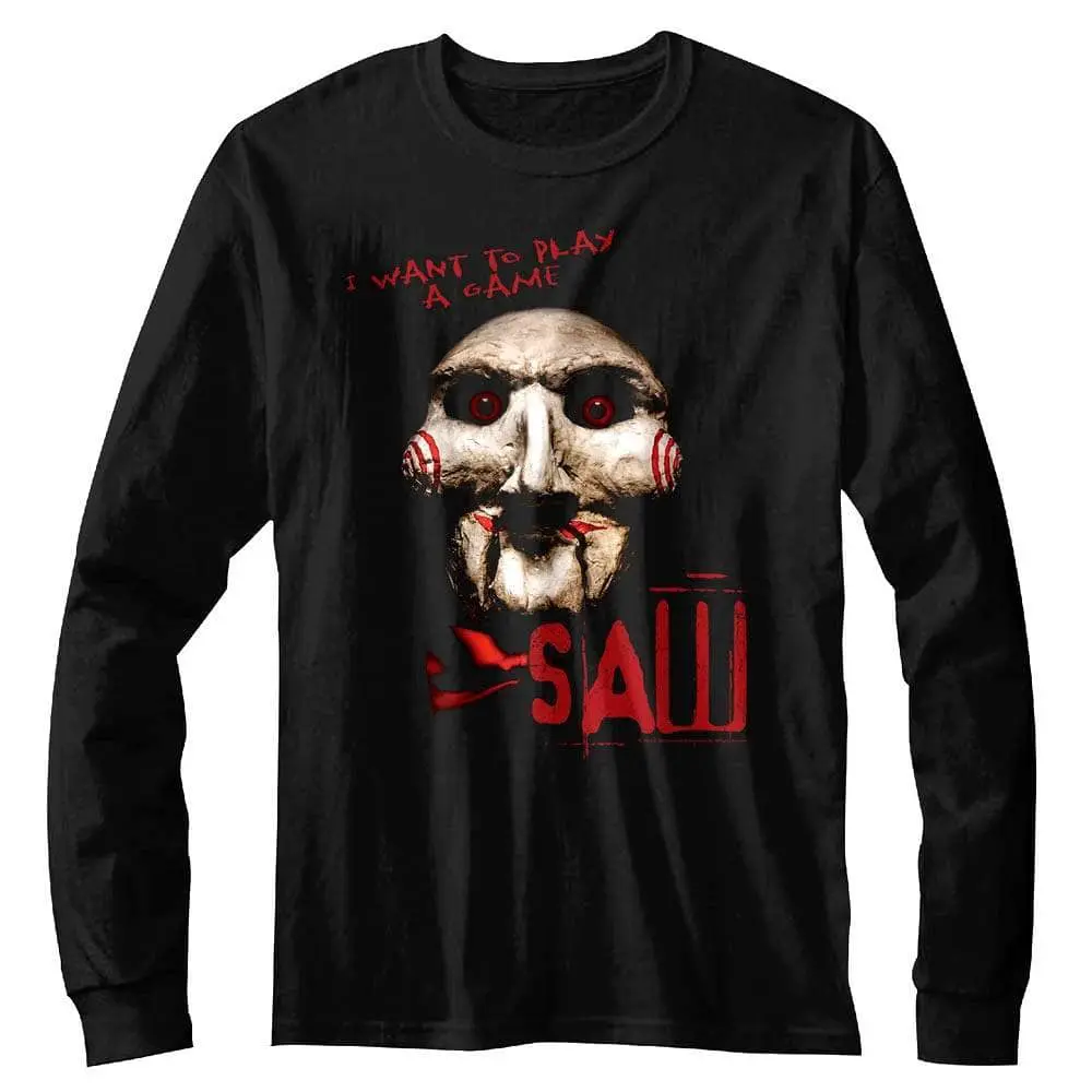 The Saw horror movie franchise grew from obscurity to a monolith consisting of 11 scary films, video games, theme park rides and a TV show in the pipeline. The first eight horror films revolve around the fictional serial killer John “Jigsaw” Kramer, while the newer movies revolve around a copycat killer while still keeping continuity with the previous films. Rather than killing his victims outright, Kramer traps them in situations that he calls “tests” or “games” to test their will to live through physical or psychological torture, believing that if they survive, they will be “rehabilitated”. Some people call it “Torture Porn” and some people call it shocking, whatever your view, you gotta admit that this Saw Billy the Puppet Evil Red Eyes Long Sleeve t-shirt is a cut above the rest (geddit!). GAME OVER
