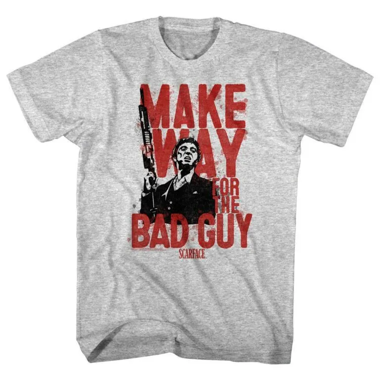 THE definition of cult classic, the 1983 version of Scarface saw Al Pacino‘s iconic role as Tony Montana the Cuban refugee in 80’s Miami. This movie inspired a generation, the rags to riches story in the crime-ridden underbelly of the drug world in Miami is critically acclaimed and hugely popular still to this day – still a very quoted movie 40 years on! As Pacino became a hollywood heavyweight, Scarface got cooler as it got older, spawning rap songs, comic books, graphic t-shirts and another remake. This 80’s inspired Scarface Make Way for the Bad Guy t-shirt is vintage style as if you got it from Tony Montana himself, mang. So… say goodnight to the bad guy.