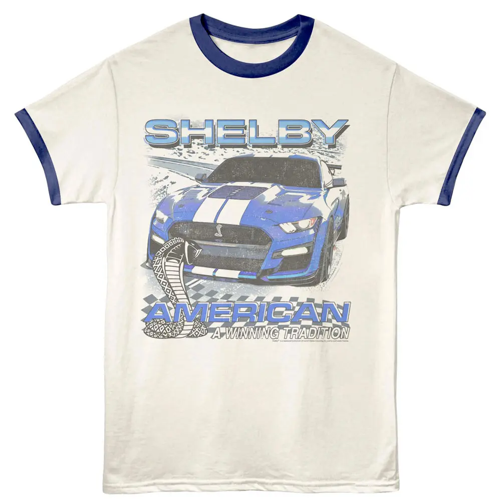 Embrace the iconic style of the Shelby American a Winning Tradition Ringer T-Shirt. Perfect for car enthusiasts wanting to showcase their passion! 🏎️