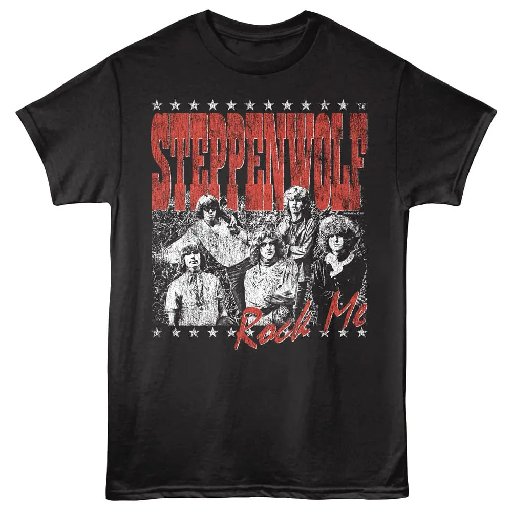 Active since the late 1960s, Steppenwolf are one of the most iconic and enduring bands of the classic rock era. Emerging from the wild 60’s Los Angeles music scene, Steppenwolf became synonymous with the counterculture and the freedom-loving spirit of bikers. With hits like Born to Be Wild and Magic Carpet Ride, Steppenwolf influences the sound of rock for generations, blending hard rock, psychedelic and blues. Known for fueling the spirit of adventure and the open road, Steppenwolf’s music continues to resonate with fans worldwide. Before hitting the open road, grab this vintage-style Steppenwolf Rock Me T-Shirts road-worn look, you’ll blend in with the other free spirits.