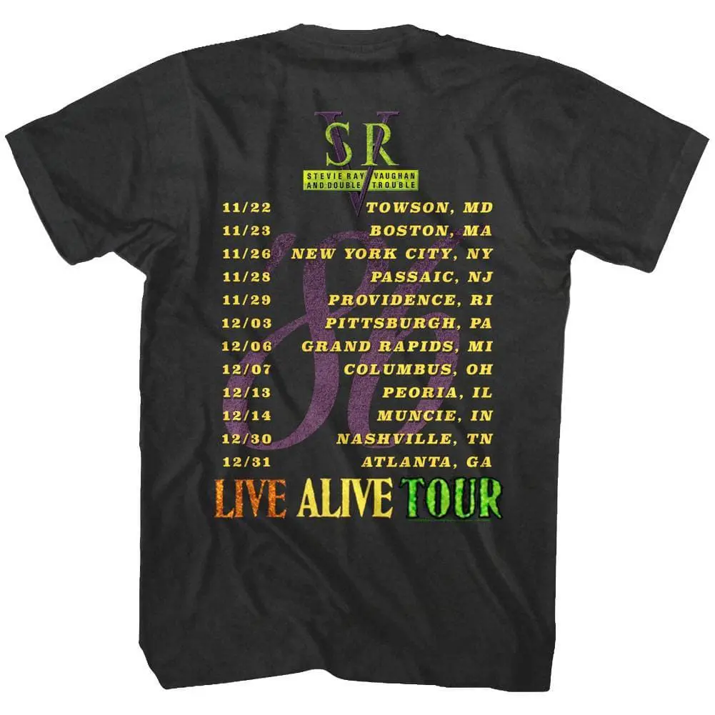 Stevie Ray Vaughan was a Texas legend and a true Guitar Hero! SRV was an American musician, singer, songwriter, and record producer, and one of the most influential guitarists of all time (according to Rolling Stone magazine). Stevie Ray Vaughan formed his own band Double Trouble and headlined many concert tours before tragically dying in a helicopter crash aged 35. This vintage-style graphic Stevie Ray Vaughan & Double Trouble Live Alive Tour 1986 T-Shirt has a distressed look as if you bought it at a gig in the 80’s