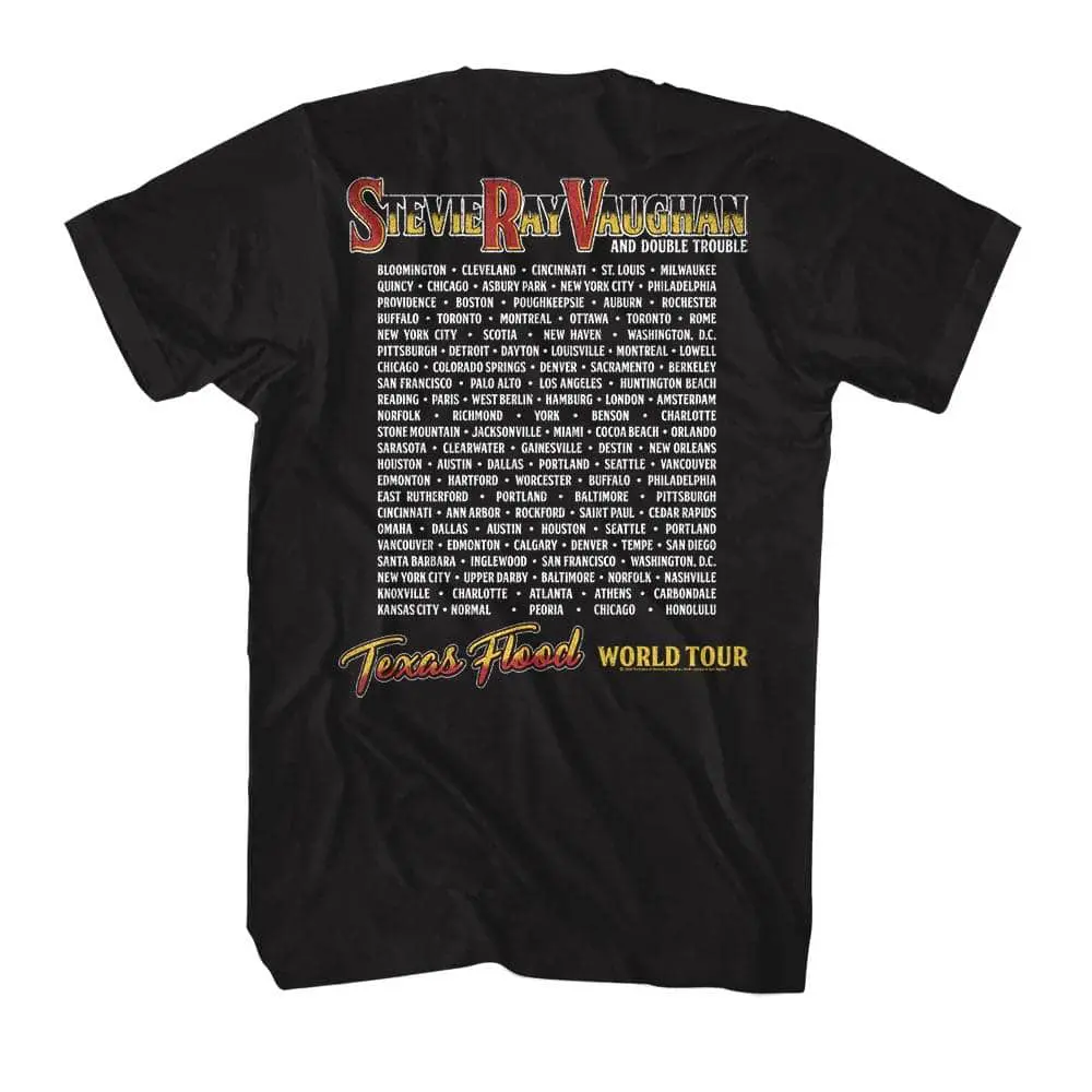 Stevie Ray Vaughan was a Texas legend and a true Guitar Hero! SRV was an American musician, singer, songwriter, and record producer, and one of the most influential guitarists of all time (according to Rolling Stone magazine). Stevie Ray Vaughan formed his own band Double Trouble and headlined many concert tours before tragically dying in a helicopter crash aged 35. This vintage-style graphic Stevie Ray Vaughan Texas Flood World Tour T-Shirt has a distressed look as if you bought it at a gig in the 80’s