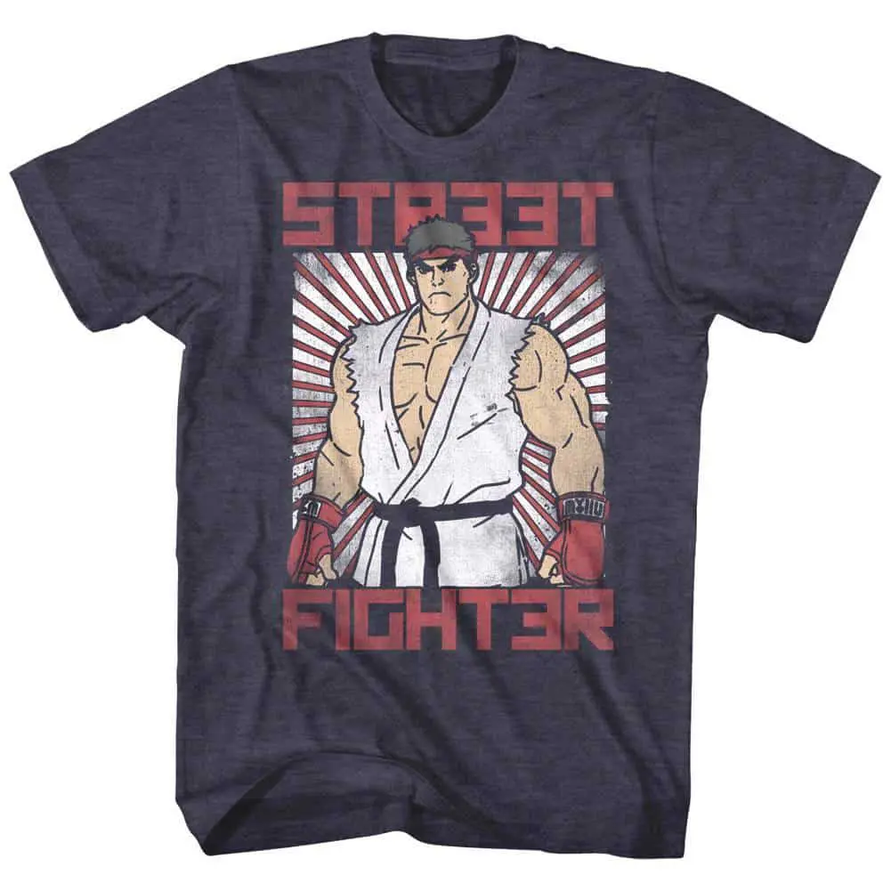 If you played arcade games in the 90’s then you had a Street Fighter character, you knew their combo moves and their backstory. This fighting video game series developed by Capcom changed the gaming industry. Since the release of the first Street Fighter game in 1987 the series had sales of more than 1$ billion qualifying it for the list of best selling video game franchises of all time. So whether you are a Ryu, Ken, Chun-Li, Guile or Blanka then we have an officially licensed Street Fighter 2 Ryu Rising Sun t-shirt just for you.