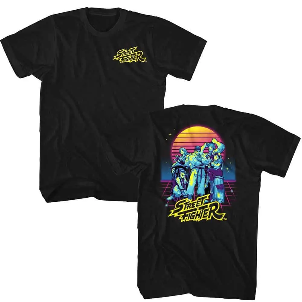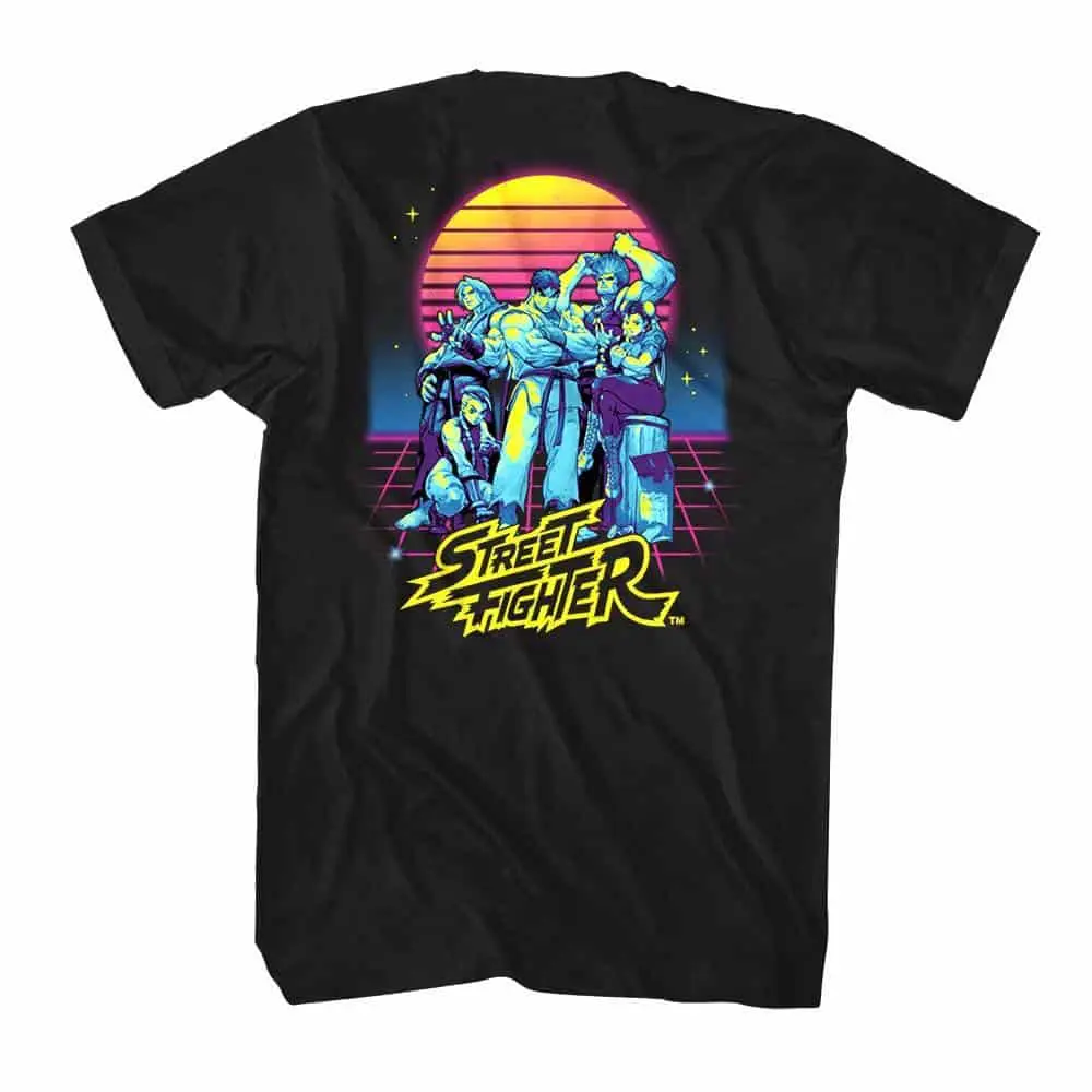 If you played arcade games in the 90’s then you had a Street Fighter character, you knew their combo moves and their backstory. This fighting video game series developed by Capcom changed the gaming industry. Since the release of the first Street Fighter game in 1987 the series had sales of more than 1$ billion qualifying it for the list of best selling video game franchises of all time. So whether you are a Ryu, Ken, Chun-Li, Guile or Blanka then we have an officially licensed Street Fighter Synthwave Sunset t-shirt just for you.