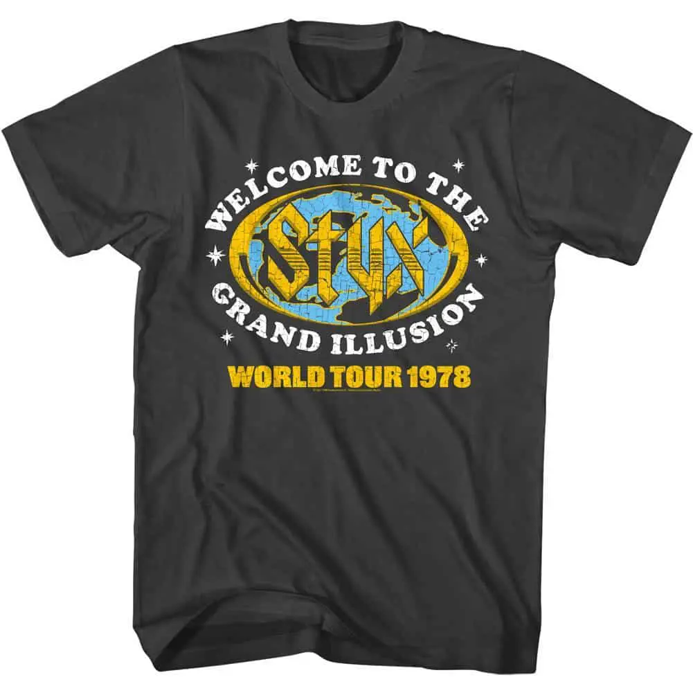 Styx Grand Illusion World Tour ’78 men’s T-shirt with vintage-inspired graphics, soft cotton fabric, classic fit, and durable print design.