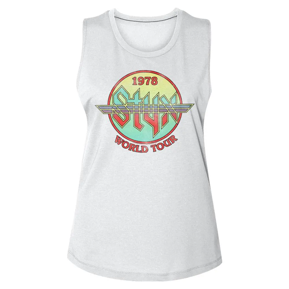 Starting life as a Chicago-based prog rock band, Styx sailed into superstardom in the 70’s and 80’s. Then Styx became known for their artistic style on both their album covers and their musical sound. Nowadays, Styx are a hitmaking machine, with 17 studio albums so far and 4 consecutive multi-platinum sellers in the 80’s and purveyors of stadium-blasting, Arena Rock sound. Their album artwork is unique (weird) as you can see on this graphic Styx Grand World Tour 1978 Tank, the faded print is intentional as if you bought it at a gig in the 80’s.