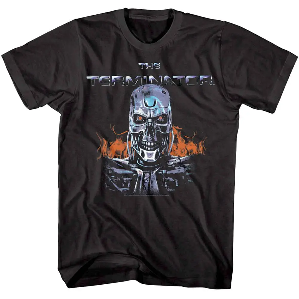 Arnold Schwarzenegger is The Terminator to a whole generation. This sci-fi cyberpunk movie franchise includes a series of 6 films, comics, novels, and t-shirts too. The Terminator shows the battles between Skynet’s synthetic intelligent machine network and John Connor’s Resistance forces with the rest of the human race. The most famous of Skynet’s cyborgs are the terminator models, such as the T-800, portrayed by Arnold Schwarzenegger from the original Terminator film in 1984. This faded graphic Terminator Flaming Cyborg T-Shirt is printed with a vintage style like you got it back in the 80’s. Even Arnie would say “I Need Your Clothes“!