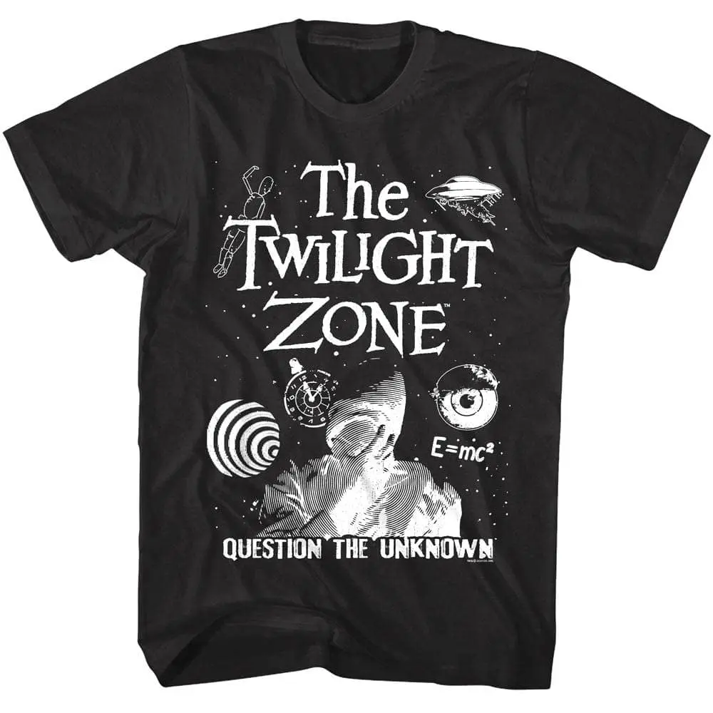Everyone knows the theme tune, I sing it when something weird happens! Put simply, The Twilight Zone is a cultural phenomenon. Difficult to describe, The Twilight Zone was a TV show that covered unusual events ranging from dystopian science fiction to psychological supernatural horror to the just weird! It was popular because each episode covered a strange story with an unexpected twist and then tying it up with a moral lesson. The success of the original Twilight Zone TV series led to multiple movies, a radio series, books, theme park attractions and then three revival television series. If you have ever had a weird experience then you need this bizarrely attractive Twilight Zone Question The Unknown t-shirt to wear in the shadows.