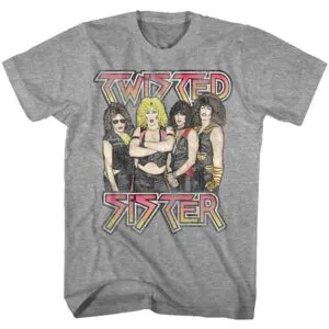 Like them or not, Twisted Sister have created so many memorable rock anthems over the years. Although the band is considered glam metal for its image, frontman Dee Snider considers the term to be inappropriate – he is strictly heavy metal! Twisted Sister founded in New Jersey in 1972 (as Silver Star) reached superstardom in the 80’s before kinda fizzling away. They are known for the slapstick humor in their music videos. Dee Snider and Twisted Sister have a very distinct glam look and this comes across in this graphic Twisted Sister Topless Girl ’76 T-Shirt with a faded look as if you bought it at a Concert Tour in the 80’s