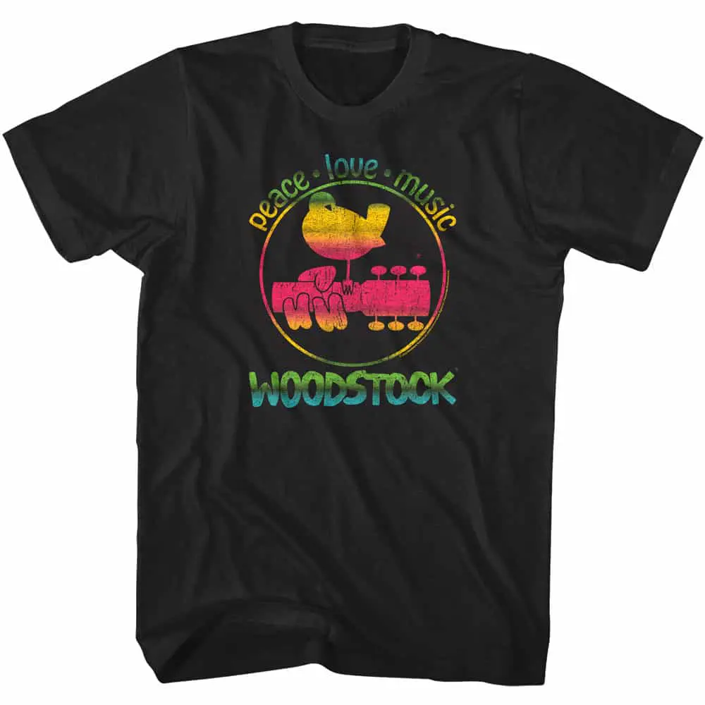 Woodstock Music and Art Fair, we know it simply as Woodstock, was a music festival held August 15–18, 1969, on Max Yasgur‘s dairy farm in Bethel, New York, – actually 40 miles southwest of the town of Woodstock. Billed as Woodstock Rock Festival “an Aquarian Exposition: 3 Days of Peace & Music”, it attracted an audience of more than 400,000 and 32 acts performed outdoors despite the rain, including legends such as The Who, Jimi Hendrix and Janis Joplin. It would go down in history as one of the defining moments in Rock Music history – a truly groundbreaking event. This vintage-esque graphic Woodstock Rainbow Peace Love & Music T-Shirt has a hippie vibe and a faded style print to look as if you bought it at THE concert.