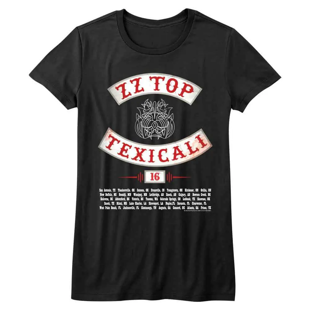 Fear the Beards! ZZ Top are Texas Blues Rock legends known for their signature look as much as their sound. Since their First Album, these Tres Hombres from Texas have been hitmakers from 1969 to La Futura. ZZ Top are loved because their songs contain funny lyrics, laced with double entendres and innuendos. After having an uninterrupted line-up since ’69, there was an enforced change with Elwood Francis joining on bass after th 2021 death of Dusty Hill. These guitar heroes have a distinct look which is reflected in this graphic ZZ Top Texicali Tour 2016 T-Shirt with a faded look as if you bought it at Rock show back in the day.