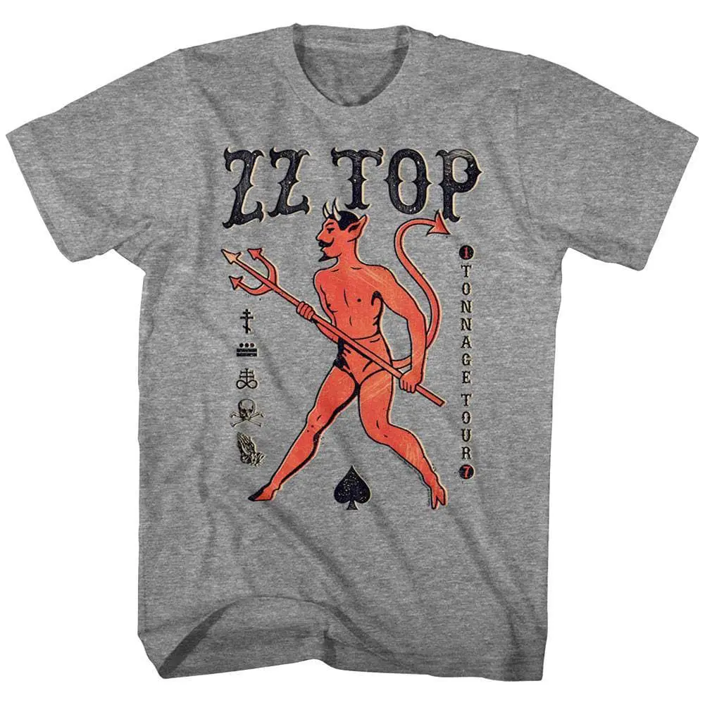 Fear the Beards! ZZ Top are Texas Blues Rock legends known for their signature look as much as their sound. Since their First Album, these Tres Hombres from Texas have been hitmakers from 1969 to La Futura. ZZ Top are loved because their songs contain funny lyrics, laced with double entendres and innuendos. After having an uninterrupted line-up since ’69, there was an enforced change with Elwood Francis joining on bass after th 2021 death of Dusty Hill. These guitar heroes have a distinct look which is reflected in this graphic ZZ Top Tonnage Tour Satan T-Shirt with a faded look as if you bought it at Rock show back in the day.